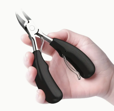 Alicate de corte de unhas com cabo preto e lâminas metálicas afiadas em fundo branco e cinzento