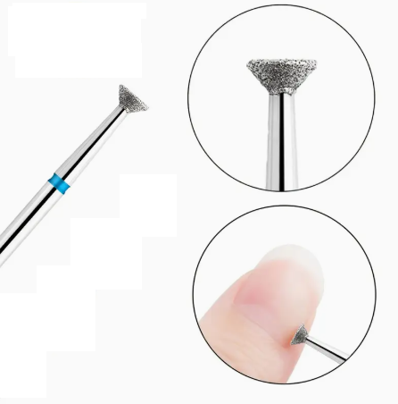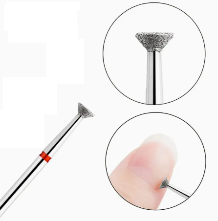 Ferramenta pequena de metal com ponta abrasiva cónica e detalhe na unha