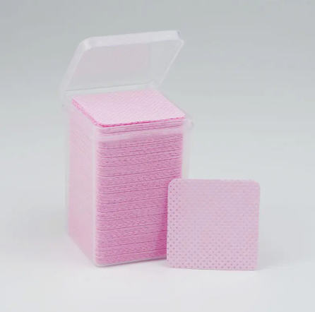 Caixa com discos de tecido não tecido rosa quadrados e perfurados
