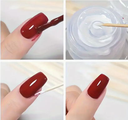 Unhas artificiais vermelhas sendo pintadas e verniz transparente aplicado