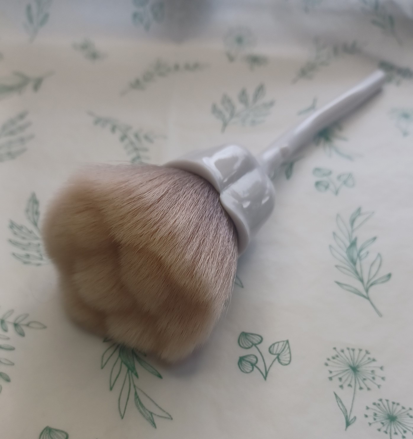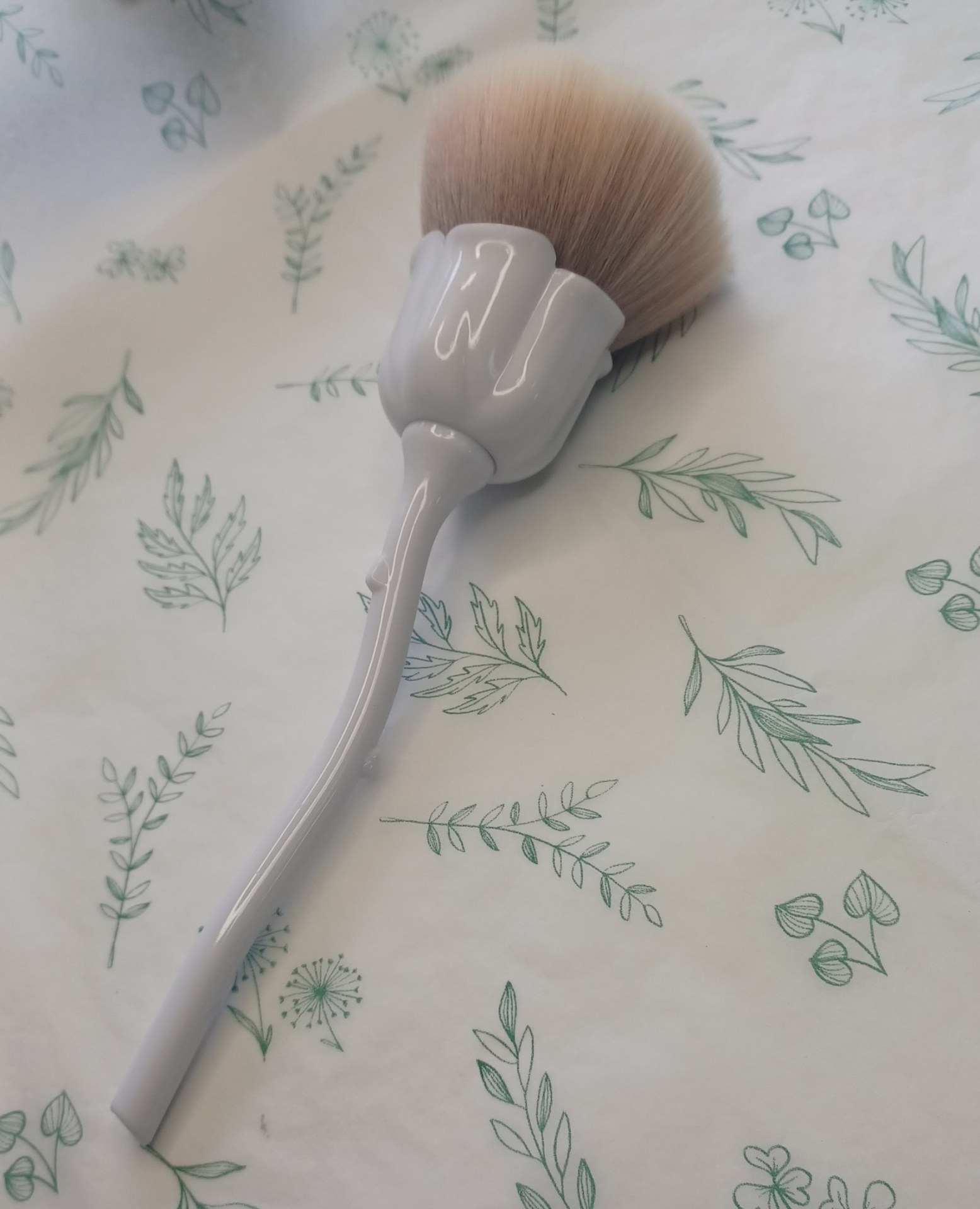 Pincel de maquilhagem com cabo branco formato flor numa superfície com padrão de folhas verde.