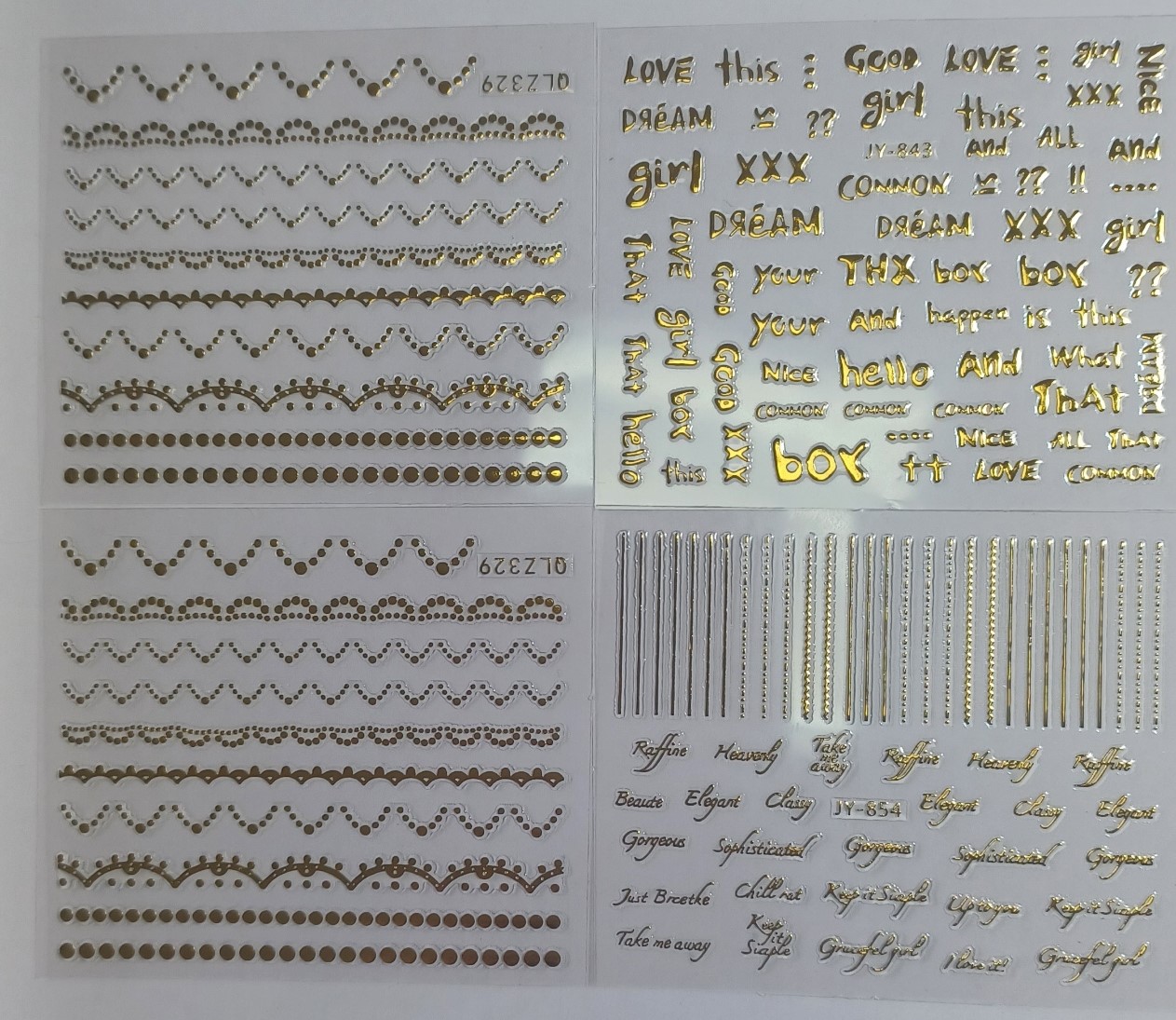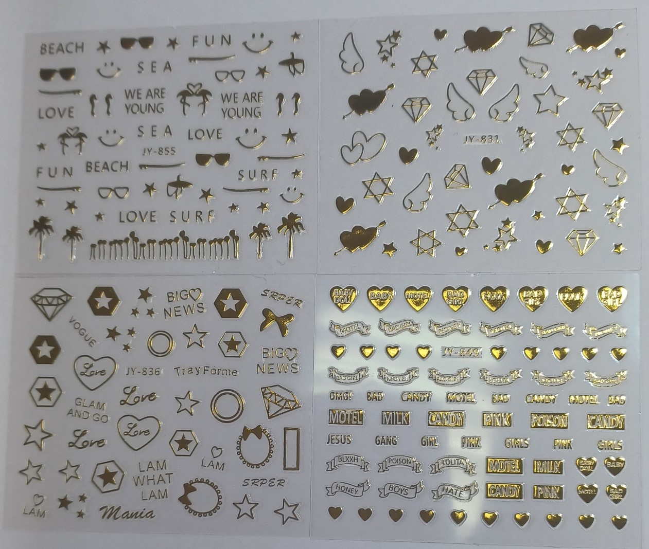 Quatro folhas de autocolantes decorativos para unhas com padrões e texto em tons dourados, prateados e castanhos