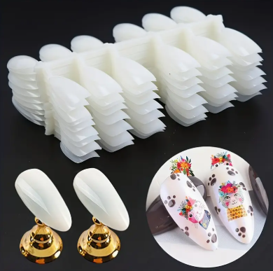 Extensões ou unhas postiças brancas empilhadas com suportes dourados e unhas decoradas com lhamas coloridas